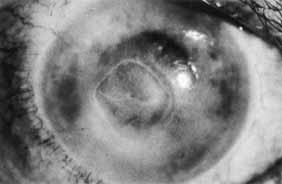 In a placebo-controlled clinical trial of 40 patients with herpes simplex disciform stromal keratitis, topical corticosteroids (betamethasone 0.01%, five times daily) were compared to placebo under antiviral cover with 3% acyclovir ointment.96 The corticosteroid-treated group healed more rapidly than the placebo group based on an evaluation of corneal thickness and iridocyclitis. Complications The epithelium may break down over the region of disciform keratitis to form an indolent ulcer. A concurrent dendritic or geographic ulcer will sometimes behave in a similar manner. Secondary fungal or bacterial infection is always possible in this situation and must be considered if there is an increase in the amount of infiltrate or if a hypopyon develops. Secondary glaucoma can persist unrecognized for a considerable period and may result in permanent visual loss from nerve fiber damage. Natural Course and Variation in Clinical Presentation The natural course of disciform keratitis is quite unpredictable. In some instances, the keratitis will persist unchanged; in others, it may worsen for a considerable period before slowly resolving with a variable, but often severe, degree of scarring (Fig. 33). The affect on vision may be more pronounced than might be expected from the appearance, because of the induced irregular corneal astigmatism. Occasionally, the amount of infiltrate will insidiously or suddenly increase (Fig. 34), and leashes of new vessels may enter the stroma to vascularize the lesion. In such instances, the appearance and course are indistinguishable from stromal keratitis. Regular examination of the cornea by sclerotic scatter is useful in observing the onset of this transition. Further recurrences of a disciform or stromal keratouveitis are likely in these patients and, in each episode, the residual effects can exact their toll on vision.