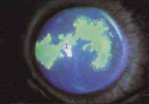 Antiviral toxicity is probably the most frequent immediate complication of recurrent epithelial herpes and it may occur as soon as 10 days after initiation of therapy. Because this is often the period when healing is occurring, the appearance of new staining can give rise to considerable confusion. It is sometimes impossible to be sure whether the signs represent recrudescence of the infection or the onset of toxicity. This dilemma may be resolved only in retrospect. When there is doubt, cessation of antiviral therapy is often necessary. Resolution of antiviral toxicity is extremely slow and may take weeks. Toxic effects of the current topical antiviral agents51 are similar, although trifluridine seems to be the least toxic of the three. Herpetic stromal keratitis is a serious complication. It develops in approximately 3% of dendritic ulcers. Steroids are frequently needed for its control. The subsequent section deals with this in detail. Management of bacterial infection in these patients should always be based on the results of isolate recovery. Natural Course and Variations of Clinical Presentation Untreated, the dendritic ulcer may spontaneously heal, but it usually persists and may insidiously arborize to previously uninvolved epithelium. Segments of the lesion may broaden, or large areas of epithelium may desquamate so the ulcer assumes a geographic configuration (see Figs. 13 and Figs. 16, 17, and 18). This is particularly likely to happen when steroids have been administered. The margins are similar in appearance to a dendrite and contain actively replicating virus (see Figs. 16 and 17). With persistence of the ulcer, especially if it enlarges, stromal involvement becomes more marked and the uveitic reaction may become more intense. Eventually the stromal keratouveitis may dominate the clinical picture (see Fig. 15).