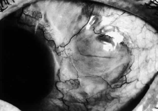 the laceration. All detachment surgeons have reason to know how poorly sclera heals; wounds often open years after surgery or open easily when surgery is repeated. Traumatic wounds, therefore, require careful and exact apposition, reposing or excising uveal tissue between the scleral edges. If strong chemicals, whether acid or alkali, come into direct contact with the sclera, they may destroy the collagen, leading to death of the tissue (Fig. 78). However, the scleral tissue rarely sequestrates but remains to form a matrix on which the fibrous scar forms. Being freely permeable, the underlying choroid is subject to more damage, and the overlying episclera may be totally destroyed. If the exposed sclera is covered by viable conjunctiva or mucous membrane, the sclera may retain sufficient integrity for some scar formation to occur. It is impossible to suture into the friable tissue, and the graft must be anchored elsewhere. Severely damaged sclera can be removed and replaced by donor tissue, which again acts as a matrix for scar tissue. However, an eye so severely damaged as to require this procedure usually becomes phthisical.