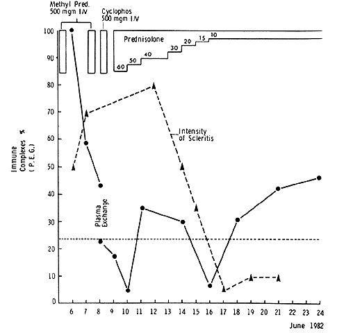 Local Corticosteroids Local steroid therapy increases the patient's comfort, but it is not effective in suppressing scleral inflammation. It is occasionally justified to use local steroid therapy alone when the inflammation is mild, the pain is slight, and corneal involvement is present, or very occasionally between attacks in the more severe forms of the disease to prevent remission. However, local steroids should be used only sparingly, if at all, in scleral disease because of the high chance of developing steroid-induced glaucoma or cataract. Systemic Therapy NONSTEROIDAL ANTI-INFLAMMATORY AGENTS. Nonsteroidal anti-inflammatory agents are effective in suppressing the inflammatory response in the majority of patients with diffuse and nodular scleritis, especially if they exhibit a high flow pattern on fluorescein angiography. Dosage levels need to be high initially and, as a consequence, care must be taken to monitor the patients to ensure that no toxic side effects occur. Treatment must be continued until the inflammation subsides, after which it can be stopped abruptly. In assessing the effect of treatment, pain, tenderness, episcleral and scleral injection, and corneal and intraocular involvement should be used as parameters of activity of the disease. In a series of double-blind controlled trials, the effects of different anti-inflammatory and immunosuppressive agents have been compared. The suggested routines of treatment are based on the results of these trials. Unfortunately, not all of the nonsteroidal anti-inflammatory agents are effective in controlling scleral inflammation. The current practice is to use flurbiprofen (Froben), 100 mg three times daily, for at least 1 week in all patients who present with scleritis of whatever type, provided there is no evidence of vascular closure or scleral destruction on slit lamp examination. The response, if it is going to occur, is immediate, with the pain disappearing within 48 hours. Within a week, the results of investigations are known, including those of the angiographic films if they have been done. If there is a poor response to flurbiprofen and the angiogram shows a high flow pattern, the drug is changed to another nonsteroidal anti-inflammatory agent, because there is an individual susceptibility among the patients. Only if there is no response in the progression of the disease or if there is evidence of vascular closure are systemic steroids or other immunosuppressive drugs used. SYSTEMIC STEROID THERAPY. If the scleritis is severe or necrotizing or if areas of vascular closure are detected with slit lamp examination or fluorescein angiography, then the use of systemic steroids is mandatory (see Figs. 40 through 44). Prednisone and prednisolone are most commonly used. The principle of treatment with systemic steroids is that a sufficient amount must be given to suppress the condition; once this has occurred, the dosage may be rapidly reduced to a maintenance level, which may have to be continued until a natural remission occurs, or the steroid may be replaced by a nonsteroidal anti-inflammatory agent. Provided sufficient amounts are given and the patient can tolerate them, systemic steroids will control scleritis. The problem is deciding what dosage is appropriate. The following scheme has been found to be effective. If the angiogram shows early vascular shutdown and treatment with flurbiprofen has not been effective, oral prednisolone, 60 or 80 mg, is given for 2 days and is reduced over 1 week to 20 mg. The dose of prednisolone is then reduced by 2.5 mg every other day until the pain recurs or signs of inflammation begin to recur. This maintenance dose is continued for about 1 month, and then the dose is reduced by 1-mg steps. This final phase may be aided by the addition of a nonsteroidal anti-inflammatory drug. Pain relief is by far the most sensitive indicator of control of the disease. If this course of treatment is not effective, intravenous pulse therapy of high doses of methylprednisolone, with or without the use of immunosuppressive therapy, should be considered (Fig. 60). Pulsed Therapy With Methylprednisolone. In very severe necrotizing scleritis or posterior scleritis when the vision is being threatened, it is important to suppress the inflammatory reaction completely. This is achieved by the use of intravenous methylprednisolone. The patient must be carefully monitored because this therapy inhibits all cellular transfer mechanisms, including the heart, and is therefore potentially dangerous. Methylprednisolone is administered by intravenous infusion as 500 mg or 1 g given over a period of 1 hour. The clinical response is observed. If this is unsatisfactory, then the dose may be repeated at 1- to 3-day intervals for three doses. It may be necessary to add other immunosuppressives to this regimen. Immunosuppressive Therapy The commonly used immunosuppression drugs used in the control of scleral disease are cyclophosphamide, cyclosporine, azathioprine, methotrexate or chlorambucil. Cyclophosphamide is the drug of choice in patients with systemic vasculitis, periarteritis nodosa, and Wegener's granulomatosis if they are not of child-bearing age. In severe cases of these disorders, cyclophosphamide is given with methylprednisolone as a bolus of 500 mg. A high fluid intake is essential to prevent hemorrhagic cystitis. Cyclophosphamide is then given orally at a dose of 50 mg three times per day. This treatment has a profound effect on the lymphocyte count, which must be monitored at weekly intervals for the first few months of treatment. Azathioprine can also be used as an adjunct to steroid therapy in those patients who require an unacceptably high maintenance dose of steroid (i.e., 15 mg prednisolone or more) to control their disease and in those with known immune complex disease (Fig. 61). Cyclosporine is helpful sometimes. Considering that pathologically there is always evidence of T-cell activation, it might be exp