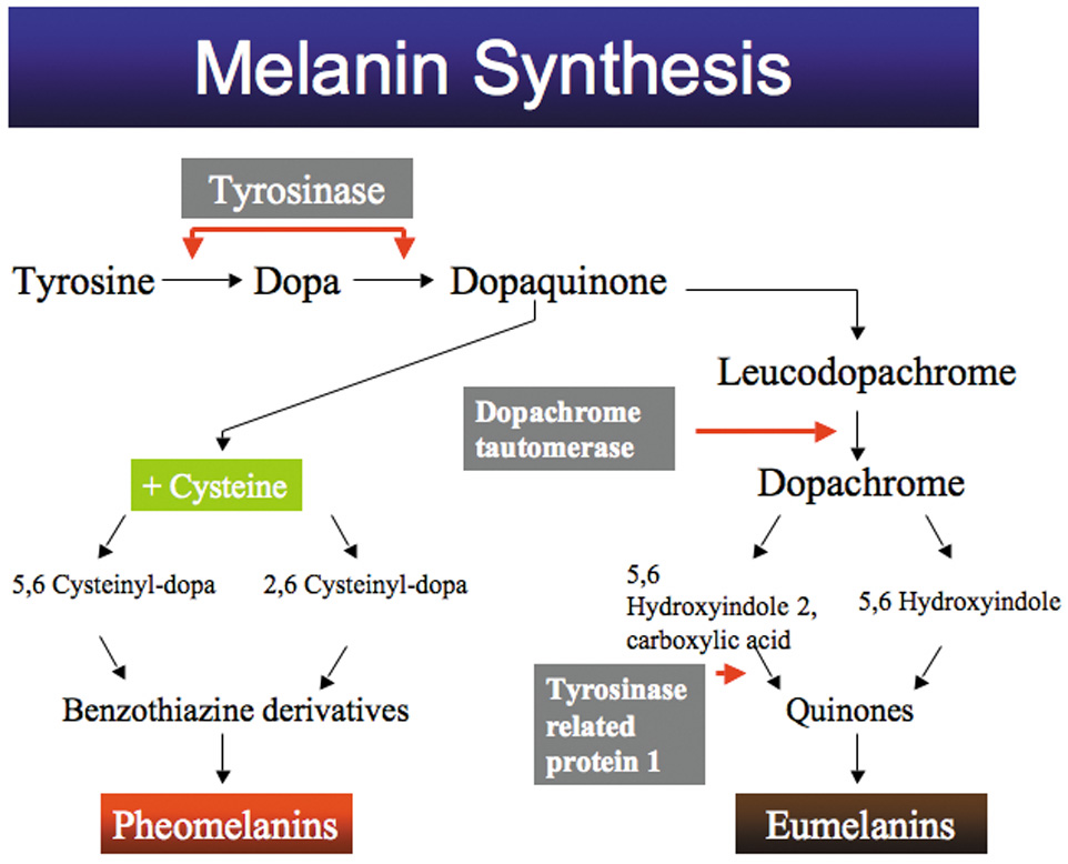 | Melanin synthesis (Fig. 1) starts with the amino acid tyrosine, which is oxidized to dihydroxyphenylalanine (DOPA) by the enzyme tyrosinase. DOPA is then