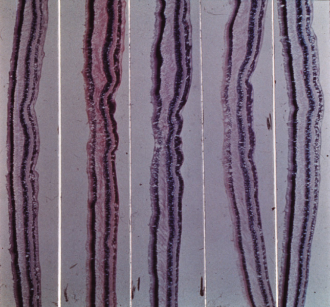 ABNORMAL DECUSSATION OF OPTIC NERVE FIBERS Carroll and colleagues43 presented evidence that human albinos have the same misrouting of the retinogeniculate projections that has been found in albinos of other species. When pigmentation is incomplete, the developing optic tracts revert to an almost completely crossed pattern at the chiasm, as is the case in more primitive panoramic systems. In normal humans, 45% of the axons that originate in the temporal half of the retina remain uncrossed as they pass through the chiasm and project to the ipsilateral lateral geniculate nucleus. The greatest number of these fibers subserves the central 20° of the temporal retina. In albinos, most of these fibers decussate at the chiasm and synapse in the contralateral lateral geniculate nucleus, leaving only 10% to 20% of fibers uncrossed (Fig. 8). These abnormalities of decussation lead to a predominantly monocular representation of the central visual field in each occipital cortex. Monocular visual-evoked responses hence lead to markedly asymmetric responses from the two hemispheres.44,45 All OCA or OA conditions in humans and animals with nystagmus tested to date have shown either electrophysiologic or anatomic evidence of a decussation defect in the optic tracts. Evidence that anomalous decussation also exists in the auditory system was presented by Creel and colleagues.46 It is thought that 1% to 2% of the human population may be heterozygous for albinism, and that this may have an adverse effect on binocular depth perception. The locus ceruleus and substantia nigra are normally pigmented in albinos. They owe their pigmentation to neuromelanin, which is synthesized by tyrosine hydroxylase rather than tyrosinase. LIGHT SCATTERING Light scattering within the eye may play some role in the pathophysiology of visual impairment in albinism, but its contribution must be minimal. For example, patients with autosomal-dominant OCA have translucent irides and an albinotic fundus, but normal visual acuity. Some of these patients complain of photophobia, which may be a consequence of light scattering. Tinted lenses can help. Corneal contact lenses with an opaque iris portion have not significantly improved visual acuity in albinos.47 LIGHT-INDUCED RETINAL DAMAGE Light-induced retinal damage does not appear to play any appreciable role in the visual impairment of albinos. There is histopathologic and ultrastructural evidence that extraordinarily intense light can produce nonthermal retinal damage even in normally pigmented animals.48 Albino animals have lower thresholds for such damage. This has been attributed to an ineffectual iris diaphragm, because normally pigmented animals show somewhat compatible thresholds with pupillary dilatation. There are no data to suggest that visual function in human albinos deteriorates with age. Nevertheless, it seems reasonable to limit exposure to unnatural, moderately intense light sources. It has been hypothesized that light-generated free radicals are responsible for nonthermal light damage. Feeney and Berman49 suggested that melanin normally plays a protective role by reducing such free radicals.49 CONGENITAL NYSTAGMUS The nystagmus that is invariably present from birth in albinism may contribute to visual impairment, and is occasionally misdiagnosed as congenital motor nystagmus or nystagmus secondary to retinal dystrophy. Black patients with OA are often misdiagnosed as having motor-defect congenital nystagmus. Contrary to the clinical impression, waveform analysis does not confirm a consistent difference in the type of nystagmus between sensorial causes of congenital nystagmus (such as albinism) and the primary motor defect type of congenital nystagmus.50 Both pendular and jerk-type patterns can be found in each group, depending on the test conditions. Also, in both groups the nystagmus consists of horizontal and rotary excursions. In motor-defect congenital nystagmus, some patients assume a compensatory head position to find a zone of least nystagmus and best visual acuity. Eye muscle surgery on such patients to shift the null point to the primary position of gaze can be effective in eliminating abnormal head positions and improving function. Although albinos typically do not assume such head positions, the author has observed a number of such patients. An occasional patient with albinism may require eye muscle surgery to correct the torticollis. An improvement in visual acuity is not to be expected, because of the sensorial defect. Four-rectus-muscle maximal recession, and disinsertion and reattachment of the rectus muscles to their original insertion site have been advocated as effective methods to reduce the amplitude of nystagmus and improve the vision of patients with albinism. The experience with such procedures to date has been very limited, and they have not been widely adopted. MACULAR HYPOPLASIA Macular hypoplasia is probably the most significant vision-limiting factor in albinos. The clinical presence of presumed “hypoplasia” has been appreciated for a long time, but it was difficult to interpret early histopathologic studies of albino eyes. There seems to be a consensus that the macular luteal pigment is absent. Postmortem serial sections through the presumed macular retina of the eyes of oculocutaneous albinos51–53 (Fig. 9) and an ocular albino54 have been studied. In each case, no foveal pit or umbo was found, but the central ganglion and nuclear cell layers were present and of normal thickness. Mietz and co-workers53 examined the eyes of a 99-year-old tyrosinase-negative albino woman. They found a posterior embryotoxon, absence of melanin in all ocular structures, and absence of a foveal pit. In the normal anatomic position of the foveola, the retina was of normal thickness, with five to seven ganglion cell layers. In another study, the morphology of the outer segments in the presumed foveal area suggested an absence of the rod-free area, and the pre