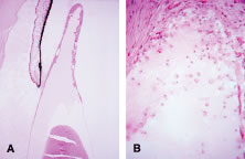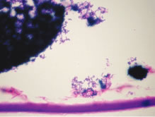 Histopathologically, the lens capsular sacs and vitrectomy material obtained from patients with P. acnes endophthalmitis characteristically show large numbers of gram-positive rods sequestered within the lens capsular sac (Fig. 6). These organisms are usually seen in close association with degenerating lens material.19 Only rarely are mononuclear cells or other inflammatory cells present within the lens capsular sac. However, mononuclear phagocytes, some of which fuse to form giant cells, are commonly present on the external surface of the capsule and within the vitreous gel. These mononuclear cells may show phagocytosed organisms, but only rarely are free bacteria found within the vitreous gel or aqueous.