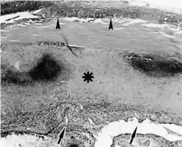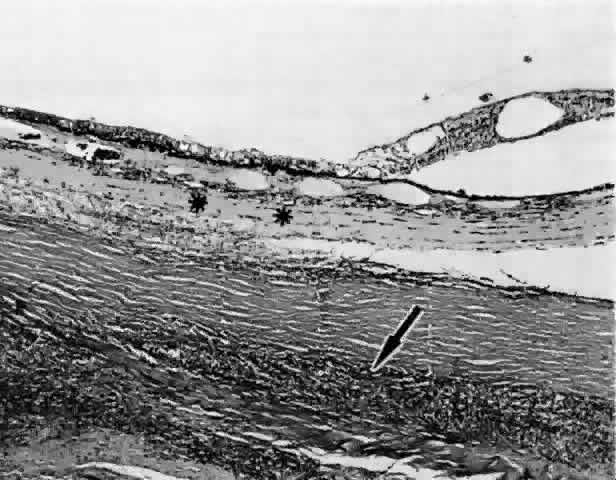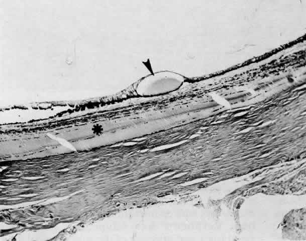 the vortex veins,4 the sclera itself,5 or through perivascular and perineural spaces in scleral emissary channels.6 Anteriorly, the connective tissue fibers that attach the ciliary body and anterior choroid to the sclera are long and oriented tangentially. A tangential arrangement permits movement of the choroid during accommodation7; however, it also readily allows for the accumulation of fluid. The anatomic arrangement of the fibers anteriorly is analogous to the tangential fibers in the outer plexiform layer in the macula, another location where fluid selectively accumulates. Posteriorly, the choroid is more firmly connected to the sclera by fibers that are short and oriented perpendicularly between the choroid and sclera.8 The choroid is also firmly anchored to the sclera at the optic disc, at the ampullae of the four vortex veins, and by the ciliary body at the scleral spur. The attachments at the disc and four ampullae account for the characteristic four-lobed structure of a large ciliochoroidal effusion. The term detachment is often used clinically to describe a ciliochoroidal effusion. Indeed, in some cases there is an actual cleavage of the fibers that connect the ciliary body and choroid to the sclera. Moses8 showed that a force of about 5 g/cm is required to break these connecting fibers. In such cases, the fluid is located between the ciliary body and choroid and the sclera and is properly referred to as a detachment. |