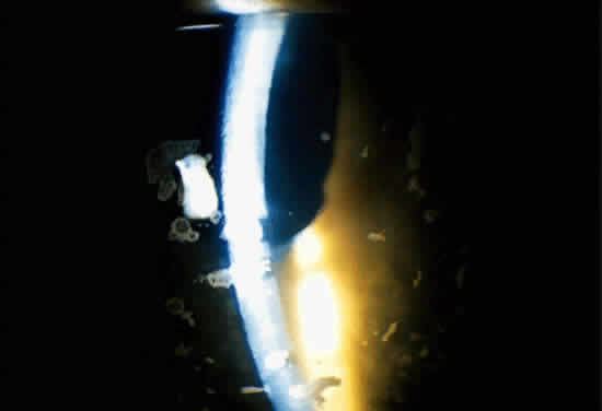 examination at the slit lamp with a contact, Hruby, 78 or 90 D lens. Frank