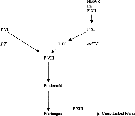 Fig. 1. Coagulation cascade. Prothrombin time (PT) measures the extrinsic pathway and the activated prothrombin time (aPTT) measures the intrinsic pathway. HMWK = high-molecular weight kininogen; PK = prekallikrein. (Adapted from Cecil's Textbook of Medicine.)
