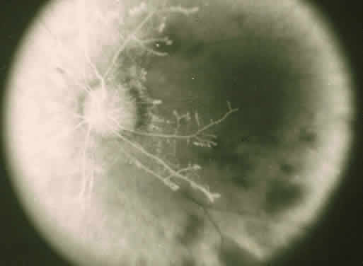 Fig. 3. Retinopathy associated with lupus anticoagulant with disc neovascularization and vitreous hemorrhage. (Kleiner RC, Najarian LV, Schatten S et al: Vaso-occlusive retinopathy associated with antiphospholipid antibodies [lupus anticoagulant retinopathy]. Ophthalmology 96:898, 1989.)