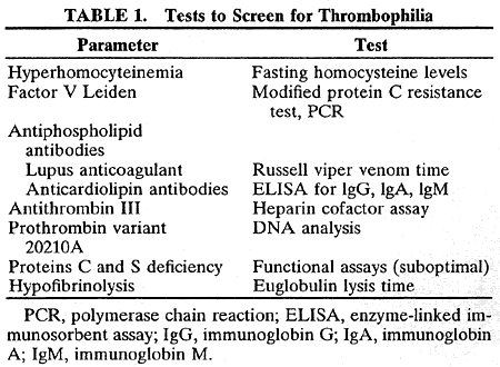 In the laboratory, the main abnormalities to search for are hyperhomocysteinemia, factor V Leiden, prothrombin variant (gene 20210a), antiphospholipid antibodies, antithrombin III, protein C and protein S deficiencies, and hypofibrinolysis (Table 1).