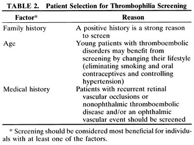A genetic risk factor that predisposes to venous thrombosis has been identified in the gene for prothrombin involving a mutation of nucleotide position 20210a. This mutation occurs in 1% to 2% of healthy individuals, 6% of individuals with the first onset of thrombo-embolic disease, and up to 18% of patients with unexplained familial thrombophilia. It is the second most common inherited abnormality, next to factor V Leiden, which leads to an increased risk of thrombosis. The mechanism by which prothrombin variant 20210a causes thrombophilia is unknown. Screening for this defect relies on DNA analysis. There is a strong interaction between this defect and other genetic risk factors, particularly the factor V Leiden mutation.6,10,11 Some reports suggest an association between prothrombin variant 20210a and ocular vascular disease. However, one report failed to confirm an association between prothrombin variant 20210a and central or branch retinal vein occlusions.17