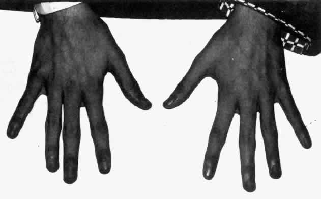 GENERALIZED SKELETAL DISORDERS Apert's Disease First described by Apert in 1906, Apert's disease (acrocephalosyndactyly) is a congenital anomaly affecting bones throughout the body. This, in turn, produces various mechanical defects of the soft tissues in contact with the abnormal bony structures (28, 41–43). Although most cases are sporadic, an autosomal dominant inheritance pattern has been demonstrated in some families. Although demographic studies have not been carried out in all populations, an estimated incidence of 1 in 160,000 live births has been calculated for Anglo-Saxon populations. Males and females are affected equally. Some recent genetic studies have implicated increasing parental (especially paternal) age as a related factor. The condition has been reported in nearly all races, and the intelligence of the affected individuals is usually normal. The cranial malformation is principally a premature synostosis of the coronal suture and the hypoplasia of the mid base of the skull and the central face. The bones involved in the latter comprise the sphenoethmo-maxillary complex. The sutural synostosis leads to a characteristic oxycephalic skull deformity in which there is an inconspicuous occiput and a high point anterior to the bregma. The forehead is vertically oriented with no slope, and the anteroposterior diameter of the skull is greatly shortened. Neurologic disturbance is a rare consequence of the cranial malformation. These patients are of normal intelligence unless there is neurologic insult. A broad, depressed nasal bridge and relative prognathism are intrinsic parts of the facial anomaly, while posterior cleft palate is occasionally reported. Other skeletal anomalies most frequently involve the vertebral bodies, the digits, and the limb girdles. A fusion of the fingers is an integral part of the syndrome and characteristically involves the second through fourth digits. The presence of a single fused fingernail is especially characteristic, while involvement of the first and fifth digits is seen occasionally. The syndactyly involving the lower extremities is more likely to include a soft-tissue union of the affected members than that of the upper extremities. The vertebral bodies exhibit varying degrees of fusion, which tends to increase with advancing age. Finally, varying bony abnormalities of the shoulder and pelvic girdles may occur which result in decreased range of motion along with pain and difficulty in active and passive movements. Many apparently unrelated visceral anomalies have been described; these include a variety of congenital defects of the heart and great vessels, polycystic kidneys and hydronephrosis, esophageal atresia and pyloric stenosis, and thyroid adenomas. The ocular findings are those secondary to the frequently present cranial anomalies and those which occur in relation to, but not as a direct consequence of, the bony malformations. An antimongoloid palpebral slant with the outer canthi measurably lower than the inner canthi is common. Keratoconus and congenitally absent superior rectus muscles have rarely been reported. Proptosis secondary to an anatomically shallow orbit may lead to severe exposure keratitis. The orbital anomaly is usually caused by an anterior dislocation and an abnormal shape of the sphenoid bone. The most common ocular defect is optic atrophy with resultant visual loss. This may be due to a bony abnormality of the optic foramen in the sphenoid bone or traction on the optic nerve secondary to the cranial maldevelopment. It may also be due to the chronic papilledema which occurs when cerebrospinal fluid dynamics are altered. The orbits are usually divergent in position, and an exotropic strabismus is commonly present. Surgical intervention is undertaken with three principal aims. First, increased intracranial pressure must be relieved by a cranial decompression procedure. When the optic nerves are compromised within the optic canals, decompressive surgery may also be necessary. Cosmetic surgery of the face and head may be performed, while reconstructive surgery of the hands has a good success rate in the treatment of the syndactyly. Marfan's Syndrome Marfan's syndrome (dystrophia mesodermalis congenita—typus Marfanus, arachnodactyly) was alluded to more than 100 years before Marfan, in 1896, put together the skeletal manifestations of the disease which now bears his name. The classic triad of Marfan's syndrome, viz, subluxated lenses, skeletal anomalies, and cardiovascular disease, implies a limited disease in both its ocular and systemic manifestations. Quite to the contrary, Marfan's syndrome involves not only the skeletal and cardiovascular systems but also the lungs, muscles, genitourinary system, and skin as well as affecting nearly every structure of the eye (44, 45, 46 [pp 61–244],47, 48). This autosomal dominant condition has great variability of expression; it affects both sexes equally, is found in all races, and is common enough to be seen several times a year in a busy clinic setting. Although the exact biochemical defect has not been identified, it is evident that the cause must be a basic anomaly of connective tissue or ground substance. The most striking physical features of a patient with Marfan's syndrome are the musculoskeletal defects. As a rule, patients are tall and have long extremities; their arm span is greater than their total height. Arachnodactyly results in characteristic hands in which the fingers are disproportionately long and thin (Fig 29-5 ). Prognathism and a high arched palate occur occasionally, and the long, thin face is characteristic. Kyphoscoliosis is the most frequently seen vertebral abnormality, while pectus excavatum is one of the most characteristic of all the bony changes. A generalized muscular hypoplasia and hypotony lead to laxity of the joints; occasionally there is contracture. Rocker bottom feet and genu recurvatum are results of joint hyperextensibility with subs