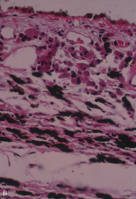 Classic histopathology consists of caseating granulomatous inflammation in a zonal distribution. The noncaseating tubercle may be present but is less specific (Fig. 18). The organism is acid-fast, meaning that it does not decolorize with acid alcohol after staining with basic fuchsin, appearing as bright red, long thin rods. A definitive laboratory diagnosis of intraocular tuberculosis may be made via anterior chamber tap, vitreous or chorioretinal biopsy depending on the site of inflammation. The PCR may be helpful in making the diagnosis.