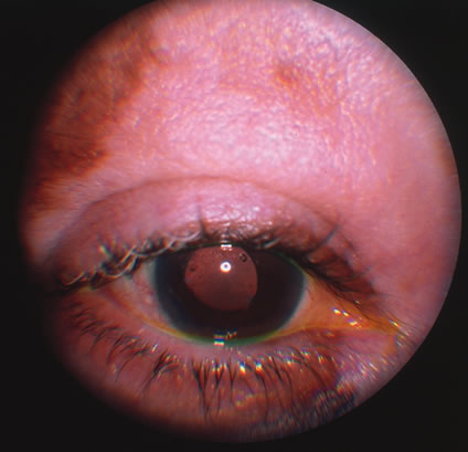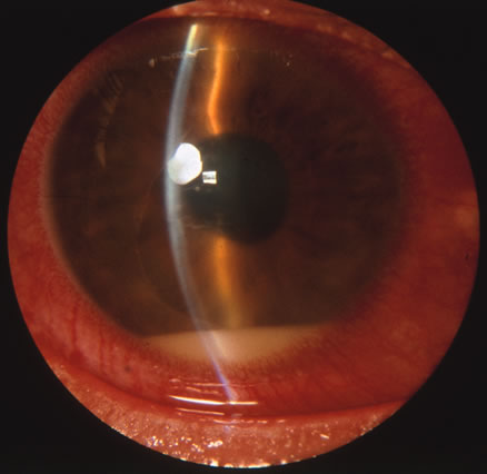 The most common organisms responsible for acute onset endogenous endophthalmitis in the United States are gram-positive bacteria. Streptococcus species are the most common group, but Staphylococcus aureus is the single most common organism.94 Bacillus cereus is associated with intravenous drug abuse. Meningococcal and Hemophilus infections occur with meningitis in otherwise healthy young patients. S. aureus and streptococci are associated with skin lesions and chronic debilitating disease such as malignancies, diabetes, and renal failure. The gram-negative bacilli are agents of urinary tract and gastrointestinal infections, often in diabetics. Nocardia causes pulmonary infections in the immunosuppressed. Actinobacillus may be responsible for endocarditis. Klebsiella pnemoniae has recently emerged as a more commonly identified cause of gram-negative endophthalmitis than previously reported.96 Definitive diagnosis is made by recovery of the organism from the eye. Anterior chamber paracentesis is more helpful in cases of endogenous endophthalmitis than in postoperative endophthalmitis. Vitreous biopsy may not be necessary in all cases, such as in patients with known sites of extraocular infection. Blood and urine cultures are always indicated, and other specimens may be helpful, depending on the clinical picture. Antigen studies such as counter immunoelectrophoresis or latex agglutination tests may aid rapid diagnosis. Intravenous antibiotic therapy is mandatory in doses comparable to those for meningitis or similarly serious infection. Drugs of choice should be appropriate to the likely organisms at the primary infectious focus. In cases of intravenous drug abuse, clindamycin plus an aminoglycoside must be considered for treatment of B. cereus. Intravenous antibiotics combined with vitrectomy and intravitreal antibiotics achieved the best outcome in terms of visual acuity in a recent retrospective study.97 It is postulated that because the eye is involved via hematogenous spread, infection is established in perivascular foci, local vascular permeability is increased, and thus the intravenous route of therapy is most effective. Later use of corticosteroids may be considered. Vision of finger counting or better is retained in 40% of eyes. A better result is achieved in patients who are diagnosed early and receive appropriate treatment. Patients with N. meningitis or H. infuenzae endophthalmitis do relatively well. B. cereus and enteric gram-negative rod infections tend toward very poor outcomes. Death is a common result in septic, chronically debilitated patients. PROPIONIBACTERIUM ACNES Propionibacterium acnes is an anerobic bacterium that is most commonly associated with late onset postoperative endophthalmitis.97 Classic presenting signs include chronic low-grade uveitis which may or may not be granulomatous, accompanied by a white fibrous plaque on the posterior lenticular surface. This plaque is thought to harbor the bacteria (Fig. 25). Disruption of the plaque through the use of a yttrium aluminum garnet (YAG) laser may disperse the organisms, further increasing the degree of intraocular inflammation. Patients may also present with a hypopyon.