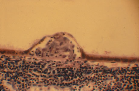 Histopathologically, granulomatous inflammation is present similar to that seen in sympathetic ophthalmia with the exception that the choriocapillaris is involved (Fig. 56). High-power microscopy shows foci of multinucleated giant cells, epithelioid cells, and lymphocytes (Fig. 57). Immunologic studies have shown the presence of retinal S antigen or antibodies to retinal S antigen in patients with VKH syndrome.207
