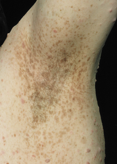 In young children, nearly half of sporadic cases fail to meet NIH criteria by 1 year of age, but meet them by age 8 to 12 years. The clinical features appear in the following order: café au lait spots, axillary freckling, Lisch nodules, neurofibromas.26 The inclusion of UBOs on MRI also aids the diagnosis of very young children25 but may require a general anesthetic. Genetics and Screening All family members of patients with NF1 should be screened. Lisch nodules are present in 90% or more of patients with the disease, so ophthalmic examination is essential. Annual ophthalmic examination with visual acuity, visual field, color vision, and fundoscopy is recommended for affected individuals. The NF1 gene (17q11.2) was cloned in 1990.76,77 Its protein, neurofibromin, is expressed throughout the body but particularly in the central and peripheral nervous system.12 It is a tumor-suppressor gene with autosomal dominant inheritance, high penetrance, and variable expressivity. NF1 has been called a neurocristopathy, but the disease is not limited to neural crest derived tissues.12,78 Neurofibromin has structural similarity to GTPase, activating proteins that inhibit the function of G proteins such as Ras. Inhibition of Ras by neurofibromin has been shown in vitro and in vivo. NF1-deficient tumors show increased levels of Ras-GTP. Increased Ras function has been shown in a number of human tumors.12,79–81 NEUROFIBROMATOSIS TYPE 2 Neurofibromatosis type 2 (NF2) was described in 1822 by the Scottish surgeon Wishart.82 Initially, NF1 and NF2 were lumped together despite their differences.83 The identification of different genes re-established them as separate entities.84 Epidemiology The NIH consensus conference22 estimated an incidence of 1:50,000 but there are varying estimates internationally.84 NF2 is autosomal dominant with full penetrance by age 60.85 In all, 10% of affected patients are symptomatic by age 10, 50% by 20 years, and 80% by 30 years.86 Some sporadic cases reflect parental mosaicism.87,88 Systemic Features Several studies have established the clinical picture of NF2.85,89–91 Patients may become severely disabled because of the combination of deafness and imbalance from vestibular schwannomas, weakness from multiple spinal tumors, and poor sight from cataracts, optic nerve meningiomas, and retinal hamartomas. CUTANEOUS FINDINGS. Skin findings in NF2 may be subtle but not uncommon. Skin tumors were found in 60% and were the first presenting sign in more than 25% of patients.92 The skin tumors are predominantly schwannomas. A minority are neurofibromas and mixed types. Clinically differentiating the histological types may be difficult.92 They may present as dermal tumors or subcutaneous nodules of peripheral nerves. NF2 plaques are well circumscribed, slightly raised, often pigmented, and hairy. They are a sensitive marker for NF222 and are more common on the limbs and trunk than the neck and face.92 Café au lait spots are not uncommon in NF2, but it is unusual to find more than five and most tend to be restricted to the trunk. Plexiform neurofibromas and axillary/inguinal freckling are uncommon.92,93 NEUROLOGIC FINDINGS.