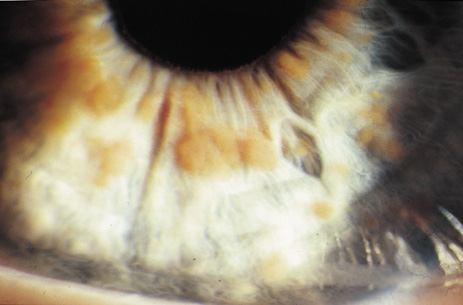 Ophthalmic Features Virtually any part of the visual system may be affected by NF1: the bony orbit, extraocular muscles, orbital nerves, eyelids, conjunctiva, cornea, uvea, retina, optic nerves, chiasm, and optic radiations. OCULAR FEATURES. Conjunctiva. Neurofibromas of the conjunctiva are infrequent, affecting about 2% of patients with NF1, often on the perilimbal conjunctiva.35 Cornea. Enlarged corneal nerves have been reported in association with NF1 but are more commonly seen with multiple endocrine neoplasia syndrome (MEN-IIb).36,37 Uveal Tract. Lisch nodules are hamartomas (a tumor involving only those tissue elements normally found at the involved site) of the iris pigment epithelium. They are dome-shaped discrete lesions, are typically light brown in color, and may also be found in the angle.38 Lisch nodules appear earlier (33% at 2.5 years, 50% at 5 years of age)39 than neurofibromas. They are benign and can help to confirm diagnosis in children who may have café au lait spots as the only other clinical finding. Lisch nodules are present in nearly all adults with NF139,40 but are rare in NF2 (Fig. 3).41,42 Diffuse nodular iris nevi (also known as iris mamillations) should not be confused with Lisch nodules. Its clinical significance is not well established.43,44