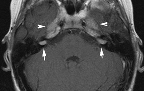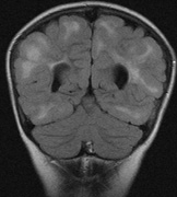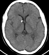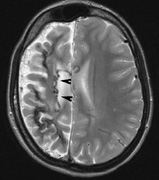 The PWS may not entirely respect the midline, possibly a reflection of transmedian innervation.212 The lesion grows proportionally with the child, often becoming darker in color. 213 The overlying skin may develop nodularity or hypertrophy in two-thirds of patients (by the fifth decade).214 Treatment with a pulsed-dye laser may significantly improve the appearance, but recurrence (i.e., redarkening) is possible.215,216 A deficit in the number of perivascular nerves in port-wine stains suggests that abnormal neural modulation of vascular flow may be involved in their pathogenesis.217 Intracranial leptomeningeal capillary vascular malformation (Figs. 21 and 22) is associated with seizures and contralateral neuromuscular weakness. Central nervous system involvement correlates highly with ipsilateral involvement of the V1 dermatome by a PWS.208,218