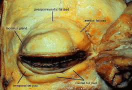 In the Asian eyelids, the eyelid creases vary in position in relation to the eyelid margin and may be lower than the occidental eyelid, or they may be absent altogether. In the upper eyelid, the orbital septum may fuse with the aponeurosis as is inserts into the tarsus. This insertion can occur as high as the superior border of the tarsus or as low as the lash line accounting for the lower or absent upper eyelid crease.3 There are also differences in the Asian lower eyelids. Epiblepharon is a common finding in the Asian lower eyelid and is seen as an additional fold of skin running horizontally below the lower eyelid margin. It is often associated with a loss of the eyelid crease or with a crease that rests very close to the eyelid margin of the lower eyelid. The absence of an eyelid crease may be due to lack of deep anchoring of the superficial skin to the preseptal portion of the orbicularis oculi muscle.18 An overriding orbicularis muscle is also associated with epiblepharon. The weight of the skin fold and the orbicularis muscle may rotate the lower eyelid margin inward, creating an entropion. FAT Fat within the orbit and eyelids serves as a protective cushion for the globe and facilitates movement of the globe. There are three general locations of fat that are described: eyelid, sub-brow, and orbital. In the upper eyelid, there are two fat pads, medial and central (preaponeurotic) (Fig. 12). The central preaponeurotic fat is divided by the trochlea of the superior oblique tendon and fascial strands of the medial retinaculum. These divisions are arbitrary and the fascial planes can be variable, because eyelid fat is interconnected and contiguous with deeper orbital fat. The preaponeurotic fat pad is an important surgical landmark, because it lies just posterior to the orbital septum and anterior to the levator aponeurosis (Fig. 13). The central preaponeurotic fat pad tends to be yellow as compared with the whiter more fibrous medial fat pad. The medial fat pad is derived from orbital fat deep to the levator muscle. It is more vascular because of the location of the palpebral arterial arcade that serpiginously courses through the medial fat pad.19,20 The lacrimal gland occupies the temporal space lateral to the central preaponeurotic fat pad. The lacrimal gland is a firm, pink, vascular, lobulated structure that produces the aqueous component of the precorneal tear film. (The anatomy and function of the lacrimal gland is described later in the chapter.) Care must be taken to avoid excision of the lacrimal gland while liposculpturing during blepharoplasty. Fine connective tissue septa extend anteriorly from the capsule of preaponeurotic fat to the orbital septum and posteriorly to the levator aponeurosis.17 The postaponeurotic or pretarsal space, located between the levator aponeurosis anteriorly and the tarsus posteriorly, may contain a small amount of peripheral orbital fat. The fibrous septa compartmentalizing superficial and deep orbital fat and extensions of the fascial sheaths of the orbital muscles and eyelid structures are of great importance to the movement of the upper eyelid.