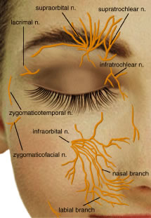 The nasociliary nerve enters the orbit laterally within the annulus of Zinn, courses over the optic nerve along the medial orbit and gives off several branches. Branches of the nasociliary nerve include: (1) long sensory root of the ciliary ganglion; (2) long ciliary nerves to supply the iris, ciliary body, and cornea; (3) infratrochlear nerve supplying the medial canthus, conjunctiva, lacrimal sac, canaliculus, and caruncle; and (4) posterior ethmoidal nerve supplying the ethmoidal air cells and sphenoid sinus.49 Patients with herpes zoster ophthalmicus who have skin lesions along a V1 dermatome and a lesion on the tip of the nose with associated kerato-uveitis (Hutchison's sign) typically have nasociliary nerve (branch of V1) involvement (Fig. 33).