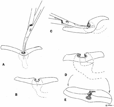 Fig. 7 The two-snip procedure. A and B. A vertical cut is made to the base of the ampulla. C–E. The scissor is passed horizontally into the canaliculis and a 3- to 4-mm cut is made.