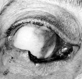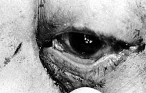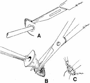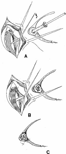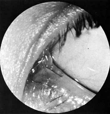 Fig. 8 A–C. Acute canaliculitis with a pouting puncta. A posterior cutdown of the canaliculus and curettage of the granules from the system.