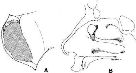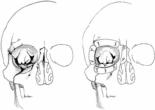 Fig. 18 A. Midfacial fractures can shear the nasolacrimal duct. The orbital contents are freed subperiosteally and elevated by split-thickness rib grafts (B). Nasolacrimal and lid reconstruction should be delayed until this major bone work of the midface is completed and it is certain that additional grafts or orbital shifts will not be required.
