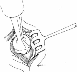 Fig. 20 Infracture of the inferior turbinate. A periosteal elevator is slipped into the inferior meatus and advanced along the length of the inferior turbinate. The patient's head is stabilized and the turbinate is pushed medially by distributing force along the entire length of the turbinate rather than just at one point. This step creates a larger space for the exit of tears from the nasolacrimal duct and minimizes trauma. The instillation of oxymetazoline (Afrin, Schering, Liberty Corners, NJ) into the inferior meatus before this maneuver will reduce intraoperative and postoperative bleeding.