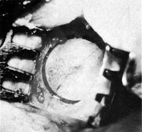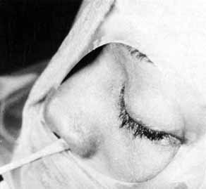 Fig. 16 Repair of the laceration. The canthal tendon was reattached with ski needles on the supramid suture. Bicanalicular Silastic tubing was passed through the nasolacrimal duct as for pediatric dacryostenosis.