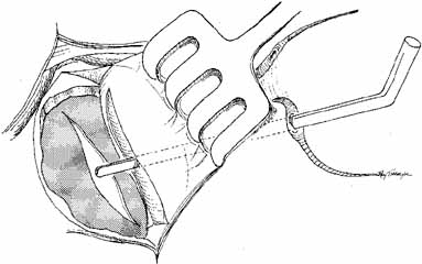 Fig. 15 Reattachment of the medial canthal tendon showing posterior placement of ski needles through the insertion of the heads of the pretarsal orbicularis muscle and running below the periosteum to the insertion of the canthal tendon.