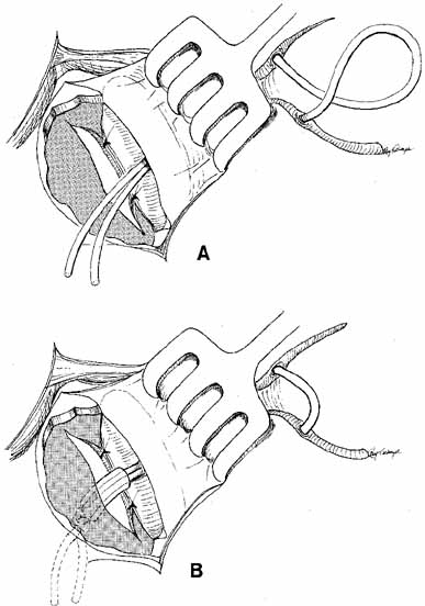 Fig. 12 A and B. Lower canalicular laceration with the distal (lateral) portion identified by a fine punctal dilator.