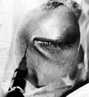 Fig. 19 Probing and irrigation of the nasolacrimal system. Hydraulic pressure is used in an attempt to force fluid through the obstruction at the valve of Hasner. If this attempt is unsuccessful, the cannula is slipped down to the point of obstruction and pushed through gently but firmly. Dye is injected from the syringe, and the patency of the system is confirmed by suctioning the dye from the inferior meatus with a soft pediatric-size plastic suction catheter.