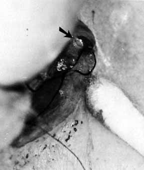 Fig. 10 A and B. Canaliculitis caused by a retained punctual plug that migrated deep into the canaliculus. A small posterior incision into canaliculus allowed for the passage of a curette (A) that retrieved the plug (B).