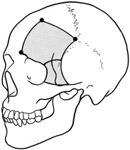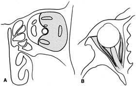 A burr hole is placed in the midline just above the orbital rim. This burr hole usually enters the frontal sinus. A second burr hole is placed anteriorly in the temporalis fossa at the junction of the cranium and orbit so that both compartments are exposed. Two or three additional holes are made in the frontal bone connecting the first two holes. The orbital rim is cut from the midline inferiorly, and the lateral orbital rim is cut from the temporalis fossa anteriorly. The dura is freed from the undersurface of the bone flap and is elevated superiorly, and the orbital roof is cracked off. The frontal bone, orbital roof, and supraorbital rim break off in one piece. The brain is retracted superiorly, and the remaining orbital roof is removed with bone rongeurs (see Fig. 14C). After removal of the bony roof, the periorbita is visible. Typically, the periorbita is thin, and the levator rectus muscle and frontal nerve are visible beneath it. If exposure of the posterior optic nerve is desired, the dura can be elevated over the optic canal. The canal can be unroofed to decompress or explore the optic nerve, and the dura may be opened to view the intracranial optic nerve and the chiasm. At the orbital apex, the annulus may be cut to allow more anterior dissection and removal of the optic nerve in cases such as optic nerve glioma or meningioma. Because the superior orbital fissure and its contents lie lateral to the nerve, the intraconal space is entered on the medial side of the optic nerve. The orbital dissection can be carried out with a minimal amount of brain retraction after the en bloc removal of the frontal bone, supraorbital rim, and orbital roof. After the dissection, the dura is closed and the frontal bone flap is plated or wired back into position (see Fig. 14D). The orbital roof is functionally restored with the replacement of the bone flap. The sinuses must be sealed off with muscle, pericranium, or other tissue. The coronal flap is closed in layers. The postoperative appearance is unchanged because the bone flap is replaced in one piece. Problems with globe ptosis, enophthalmos, pulsatile proptosis, or meningitis are rare. However, extensive mobilization of the temporalis may result in cosmetically significant temporal atrophy. Orbital apical dissection often results in extraocular motility dysfunction as a result of traction on the third, fourth, or sixth cranial nerves, but cranial nerve function usually recovers unless the nerves have been transected. Indications Transcranial orbitotomy provides access to the superior two-thirds of all the orbital compartments (Fig. 15). In some cases, the craniotomy is used only to provide access to the orbit that is otherwise not possible, such as biopsy of an orbital apex mass. Its primary use is for exploration of tumors involving the orbital apex, or large tumors extending above and medial to the optic nerve. The transcranial orbitotomy also is used as part of combined procedures for approaching tumors involving the orbit as well as the anterior and middle cranial fossae. Most commonly, this involves sphenoid wing meningioma resection.