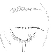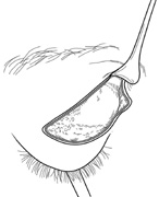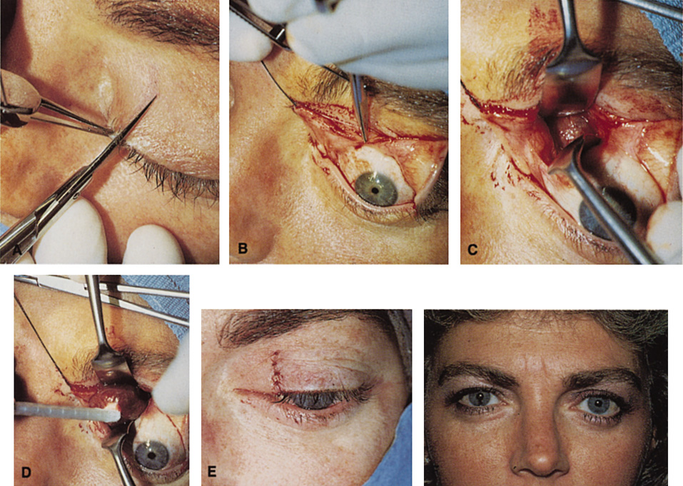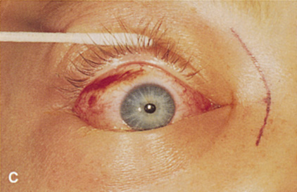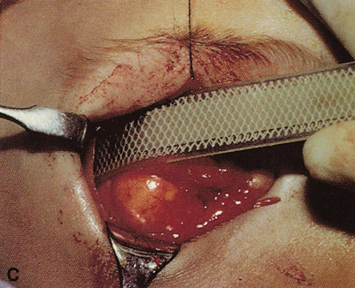 After removal of the lesion, repair is carried out in a fashion identical to that used for repair of a lid marginal laceration. The bulbar, fornix, and palpebral conjunctiva are reapproximated and the tarsal plate meticulously realigned at the lid margin with a vertical mattress 7-0 Vicryl suture. Additional sutures to realign the lash line are followed by closure of the orbicularis and skin. Indications This approach allows for excellent scar camouflage with maintenance of appropriate lid height and contour. It is useful for exposure of superior orbital lesions that lie medial to the optic nerve (see Fig. 26G, H). Well-encapsulated peripheral and intraconal lesions posterior to the globe may be reached fairly readily with this approach. |
