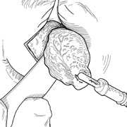 by medical management or radiation therapy. An incisional biopsy is performed when a representative piece of tissue is removed but some of the lesion is left behind. This type of biopsy is used to confirm a clinical diagnosis before proceeding with medical therapy or radiation therapy (e.g., lymphoma, orbital pseudotumor, rhabdomyosarcoma). It also may be used to obtain a tissue diagnosis before planning a definitive surgical treatment such as exenteration or extensive orbitocranial resection (e.g., malignant lacrimal gland tumors). In some cases, incisional biopsy provides a tissue diagnosis and also is used to debulk a tumor. Diffuse infiltrative orbital lesions usually require incisional biopsy to confirm the diagnosis before other therapy can begin. An excisional biopsy is performed when an orbital mass is removed in its entirety. Excisional biopsy is performed on lesions that are believed to be benign, well localized, and easy to remove without damage to surrounding orbital tissues. As a general rule, well-circumscribed and encapsulated lesions are treated with excisional biopsy. This is especially important in cases of benign mixed tumors of the lacrimal gland or orbital dermoid cysts where incision through an intact capsule dramatically increases the chance of recurrence and orbital morbidity. In general, malignant lesions of the orbit are not amenable to excisional biopsies, because tumor-free microscopic margins cannot be obtained in orbital fat. |