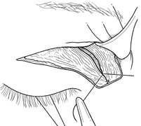 Procedure A vertical lid incision is made full-thickness through the lid margin transecting eyelid skin, orbicularis muscle, tarsus, distal levator aponeurosis, Müller's muscle, and palpebral conjunctiva with straight iris scissors. It is important to remain exactly perpendicular to the lid margin (Fig. 26). The incision is then extended posteriorly through the conjunctival fornix and is reflected through the fornix back down the bulbar conjunctiva to the limbus. After traversing fornix and bulbar conjunctiva, dissection proceeds posteriorly into the medial orbit. The superior oblique tendon can be identified crossing from the trochlea, medially, to the superior equator of the globe, laterally, and may be retracted. Ready access to the intraconal space then is afforded in the superonasal quadrant between the medial rectus and superior rectus muscles.