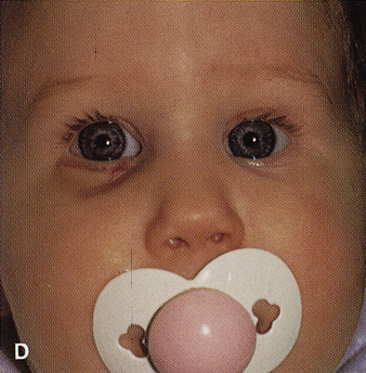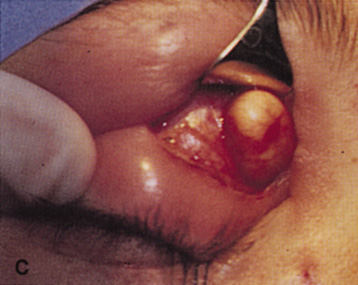 After the periorbita has been elevated internally, and the periosteum reflected laterally and superiorly to completely expose the lateral rim, a large malleable retractor is placed between the orbital contents and the mesial surface of the lateral orbital rim. This protects the orbital contents while an air-driven saw is used to make two osteotomies. One is placed superiorly about 0.5 cm above the zygomaticofrontal suture. Aligning the saw blade toward the upper molars on the opposite side (an angle of 45°) produces a wide opening while avoiding inadvertent entry into the overlying frontal cranial fossa by the saw blade. Finger palpation of the orbital roof beneath the brow reminds the surgeon of the location of the frontal lobe and helps ensure that the saw is not angled in a fashion to allow intracranial penetration. A second osteotomy is made inferiorly through the lateral rim just adjacent to the floor of the orbit above the zygomatic arch. The osteotomies may be shifted superiorly or inferiorly depending on the exact location of the orbital lesion, but an opening in the lateral wall of 2.5 to 3 cm is desirable. After the saw cuts have been made, a wire-passing drill bit is used to preplace drill holes above and below each of the two osteotomies so that the bone can be refixated at the completion of the procedure. Care is taken again to angle the superior drill hole to avoid intracranial penetration and to protect orbital contents with a wide malleable retractor. The lateral rim is out-fractured with large rongeur by gently “rocking” the rim outward, and remaining strands of temporalis muscle at the posterior edge of the bone fragment may be cut with the unipolar cautery. The rim is removed and placed off the field in moist gauze. Great care is taken to avoid inadvertent contamination of the lateral rim as it will be replaced at the end of the procedure. After out-fracture of the lateral rim, the thinner bone behind the rim can be removed with a rongeur to provide better access to the orbital apex. Bone removal usually is carried posteriorly to the pterion, the thicker wedge of cancellous bone that constitutes the body of the greater wing of the sphenoid. Hemorrhage from the cancellous bone may be brisk and may require tamponade with bone wax for control. The temporalis fascia is retracted posteriorly with broad malleable retractors so that the apical periorbita can be exposed. Relaxing incisions can be made with the unipolar cautery through the superior temporalis muscle if it is difficult to adequately expose the apex. The lateral rectus muscle and lacrimal gland lie just beneath the periorbita along the lateral orbit (see Fig. 6F), and damage to these structures is avoided by opening the periorbita with blunt-tipped scissors. A traction suture placed transconjunctivally beneath the insertion of the muscle can be manipulated to help identify the belly of the lateral rectus posteriorly in the orbit. A longitudinal periorbital incision beginning anteriorly and extending back to the orbital apex will allow extensive retraction of the periorbita. Additional vertical relaxing incisions through the periorbita may be made anteriorly. The periorbita is retracted, and the lateral rectus muscle and lacrimal gland are identified. If the lesion lies in the intraconal space, sharp dissection to release the intermuscular septum, either above or below the lateral rectus muscle, is usually required to gain access to the retrobulbar space. Sewall orbital retractors provide retraction of the lacrimal gland and lateral rectus muscle. Depending on the location of the lesion superiorly or inferiorly within the orbit, dissection is carried out above the superior border or below the inferior border of the retracted lateral rectus muscle. Deep orbital dissection requires fiberoptic illumination and loupe magnification at a minimum, and often it is best performed with the operating microscope to aid in identification of the vital vascular and neural structures within the orbit. After removal or biopsy of the proposed lesion, the orbital rim is reinserted and fixated with sutures passed through the predrilled holes, or with rigid screw and microplate fixation (see Fig. 6H). Usually it is not necessary or desirable to close the periorbita because this allows for decompression of any postoperative retro-orbital hemorrhage into the temporal fossa. After the bone has been resutured in place, the anterior cut edges of periorbita and periosteum along the lateral rim may be loosely reapposed over it to prevent the overlying orbicularis-skin flap from adhering to the bare bony rim. The eyelid crease incision can be closed with a running suture (see Fig. 6I) as one would after upper blepharoplasty. A drain may be placed in the temporal fossa and brought through the lateral aspect of the incision or through a separate stab wound and connected to external suction for the first 24 hours postoperatively if there is any question about complete hemostasis. Indications Lateral orbitotomy provides excellent access to deep lesions in the subperiosteal, peripheral, or intraconal space lateral to the optic nerve (Fig. 8A, B).