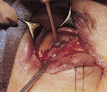 The lateral rim may be left in place and dissection carried out anterior to its posterior recess at the lateral canthus (see Fig. 29B). Because the lateral rim recesses posteriorly at the canthus, the posterior surface of the globe and anterior retrobulbar space usually are accessible. If exposure is limited, the lateral rim can be partially thinned with a bone burr until there is ready access to the retrobulbar space. Sharp dissection through the intermuscular septum allows entry into the retrobulbar intraconal space (see Fig. 29C). Closure is accomplished by simply reapproximating the superior and inferior crura of the lateral canthal tendon and closing the canthotomy skin incision. INDICATIONS Anterior peripheral and intraconal lesions and the lateral retrobulbar optic nerve can be readily approached with this technique. There is no need for disinsertion of the lateral rectus muscle because its belly can be retracted out of the field. |