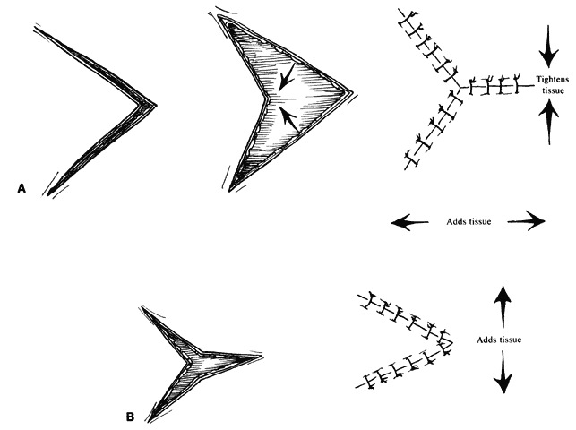 Fig. 3. A. V to Y procedure. B. Y to V procedure. These procedures tighten or add tissue in the direction indicated. They may be combined with other procedures such as Z-plasty.