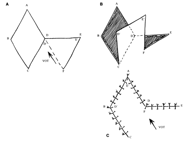 If the VOT is not ideal, it can be changed somewhat by extending or shortening the far side of the flap. By extending the far side of the flap (see Fig. 5A, line EF), the pivot point is moved more toward the long axis of the defect (see Fig. 5A, line AC). The more parallel the VOT is to the long axis of the defect, the less tendency there is for the defect to widen. However, this also moves the pivot point farther away from the junction of the short diagonals, making it more difficult to close the donor defect.