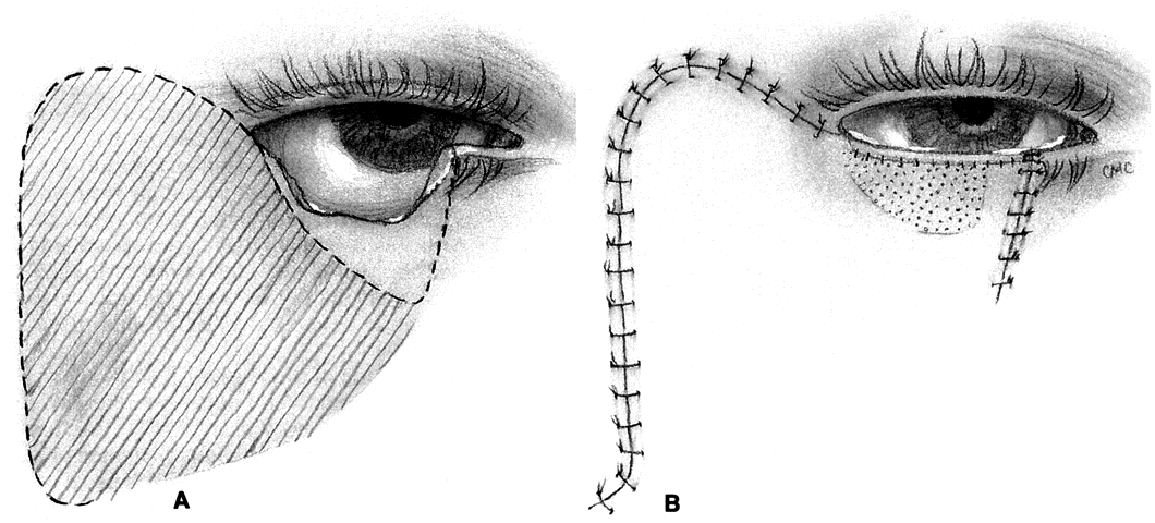 MUSTARDÉ CHEEK ROTATION FLAP. The Mustardé flap20 has the reputation of being a major operation. If necessary, it can be used to close big defects that are difficult to manage by other techniques. Although we perhaps see very large primary tumors less frequently now than in the past, recurrent lesions (especially morphea-type basal cell carcinoma) can be widespread by the time they are detected, resulting in large defects at the time of removal. Large skin grafts require the use of less than optimum donor sites (see Grafts section) or two or more sites. If possible, split-thickness grafts should not be used on the lids or face to avoid contraction. A large flap, with grafts for the posterior lamella, may therefore be the best option and can give satisfactory results when well performed. However, the cheek rotation flap has the inherent disadvantage of producing an inferior vector of traction during healing, which is aggravated by gravitational forces; this makes ectropion or lid retraction with scleral show more likely. Other disadvantages include a large scar and the possible necessity of excising considerable amounts of normal tissue, since in addition to the lid defect from primary tumor excision, a large superiorly based triangle of skin with the nasal edge at the nasolabial fold will also need to be excised. Possible facial nerve damage from the dissection of the full-thickness musculocutaneous flap may also occur.