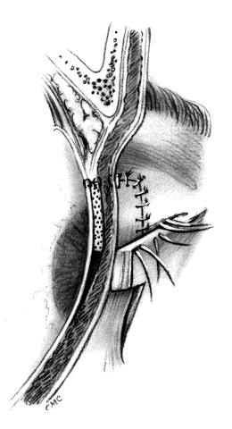 TENZEL ROTATION FLAP. In the mid to late 1970s, Tenzel10 and later Tenzel and Stewart11 described the semicircular flap to reconstruct the central one half of the lid. The results of earlier operations in this area were not as satisfactory as the results with Tenzel's technique, which has since become popular. Jordan and colleagues12 reported on some modifications of this technique in a medium-sized series. They found that they were able to close defects of 50% to 70% of the central and medial margin and defects of almost any size if medial and lateral stumps of tarsus remained. Their modifications involve making a more vertical incision at the canthus, more extensive undermining laterally, and if necessary, division of the conjunctiva and lower-lid retractors to allow further mobilization of lid remnants. Their extensive lateral dissection has the disadvantage of possible injury to the facial nerve (cranial nerve VII).