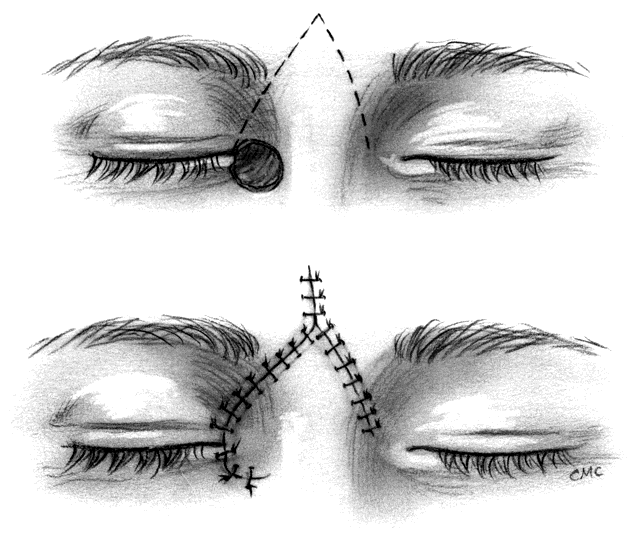 Harvey and Corin8 described a simple closure of skin defects not involving the lid margin or lashes. In the typical case of a tumor overlying the tarsus, the lesion is excised by producing a base-up triangle. An infralash incision is performed medially and laterally, extending the base of the triangle as necessary with undermining to allow rotation of skin flaps into the defect. Closure gives horizontal rather than vertical tightening and produces little vertical scarring forces. Lesions close to the lid margin are effectively removed in cases where a vertical ellipse, an alternative closure, may be difficult.