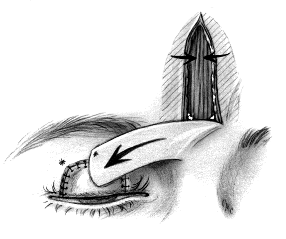 A further variation of the Hughes-type tarsoconjunctival flap to close a lateral upper-lid defect was presented by McCord and Wesley.28(pp80–82) Again, this is a modification of a procedure Hughes previously described in which he used aspects of his procedure to help rebuild the upper lid with smaller (one half or less) medial or lateral defects.24 McCord and Wesley elevated a tarsoconjunctival flap centrally, which in effect is a partial-width Hughes' flap. The flap is used to fill the lateral upper-lid defect by rotating it into the lateral defect where it is sutured to the canthal tendon remnants and the lid margin at the edge of the tarsal defect. The flap is then covered by a skin flap or graft.