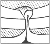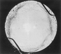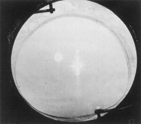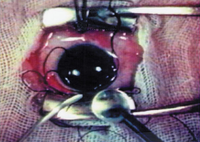 Ridley said that the cataract operation “without a replacement lens was an incomplete, only half finished operation”11 and that he would like to be remembered as the man who cured or at least initiated the cure for aphakia. He saw aphakic vision as a highly significant but unnecessary disability. Now only a memory, at least in the modern world, aphakic vision contained many disturbing visual side effects. The roving scotoma, Jack-in-the-box phenomenon, 30% magnification, distortion, loss of side vision, and extreme spectacle dependence were disabling for many patients. Because of this, even as late as the mid-1970s, surgery was typically performed only when the patient's vision decreased to 20/70 or worse in the better eye, with that eye undergoing operation 3 days after the first eye. In recognition of his pioneering efforts in IOL development and implantation, Mr. Ridley was knighted on February 19, 2000, by Queen Elizabeth II, 50 years after his first implantation. Warren Reese was the first American surgeon to perform the first IOL surgery in the United States at the Wills Eye Hospital, Philadelphia, in 1952. Mr. Ridley himself performed the first operation in America and gave the lenses to him after delivering a lecture at the Chicago Ophthalmological Society. Despite that early beginning, it would take more than 25 years for IOL implantation to become the dominant and standard accepted method of curing aphakia in the United States. The Ridley lens was placed in the posterior chamber after ECCE (Fig. 3). The anterior capsulectomy of the day was very large, and thus zonular support was poor. Some Ridley lenses dislocated into the vitreous because of poor zonular support, and partially because of their weight, which was approximately eight times that of current IOLs.