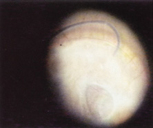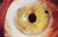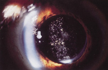 The most recent lens has had problems, but earlier models had ametropia, pupillary block, decentration, pigment dispersion, increased intraocular pressure, and cataract formation. The ICL is a single-piece plate design. The lens can be folded and inserted through a suture less corneal incision smaller than 3.0 mm. The myopic lens has an optical zone varying between 4.5 and 5.5 mm according to the power required. It is 7.0 mm wide and 11.0 to 13.0 mm long, with differences of 0.5 mm between different lengths. The lens is supplied in powers ranging from –3.00 to –20.50 D. Required are high predictive accuracy of the ciliary sulcus dimension, preoperative peripheral iridotomies, an AC depth working space of 2.8 mm, and a 3-mm clear corneal incision. It has been used successfully to improve vision in children with refractive amblyopia in whom traditional treatment had failed.187 It is currently awaiting FDA approval in the United States. Medennium Phakic Refractive Lens The Medennium phakic refractive lens is not available in the United States, but it is available in Europe. The phakic posterior chamber IOL manufactured by IOLtech (formerly Ciba Vision Corp.) is termed the phakic refractive lens (PRL) (Duluth, GA). It is manufactured from a clear silicone, with a refractive index of 1.46 and an overall length of 10.9 and 11.3 mm. A major feature of this lens is said to be that the hydrophobic nature of its material associated with aqueous flux dynamics would maintain the lens away from contact with the anterior capsule of the crystalline lens. The IOL would “float” on the natural lens, and “no touch” on this ocular structure would be observed even during accommodation. Lens opacification has been shown to occur in up to 14.5% of patients with other minor complications less frequent.188,189 Dislocation into the vitreous cavity because of zonule disruption is rare but has been reported in several cases190 (Figs. 72 and 73). BIOPTIC A serial combined procedure called Bioptic combines the creation of a corneal flap with a microkeratome and phakic IOL implantation.191 Three to five months later, the flap is lifted and a final refinement is added to the overall correction with the excimer laser (Fig. 74). The flap is made before IOL implantation because of the risk of endothelial damage when the AC shallows when the suction ring is placed and the suction is activated. LASIK or IntraLASIK after implantation with the Verisyse IOL should not present such a problem because the AC deepens with application of the suction device. |