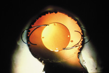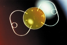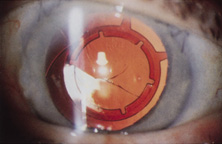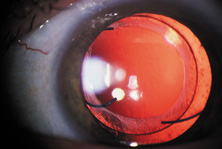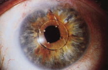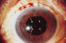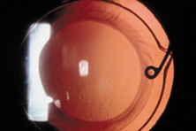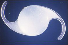 AC lenses had problems as well. Ellingson's uveitis, glaucoma, hyphema syndrome13 was associated with their use. Chronic irritation of the delicate structures of the angle caused this problem, and even without it, pain could sometimes be elicited by simply touching the eye. Later, similar rigid AC IOLs would have similar problems. Some had to do with sizing difficulties; others were problems of poor finish and the misapplication of polypropylene haptics in the AC, where they underwent ultraviolet (UV) degradation. Ultimately the flexible AC IOL was developed, most commonly the Kelman Multiflex (Fig. 5). This style of IOL features rather broad area smooth footplates, which can be placed in the angle without causing the chafe and erosion that small-sized loop-shaped haptic IOLs did. The Multiflex-type lens has provided excellent performance with similar and sometimes lower long-term corneal endothelial cell loss in secondary implantation than has the sutured ciliary sulcus posterior chamber IOL.14