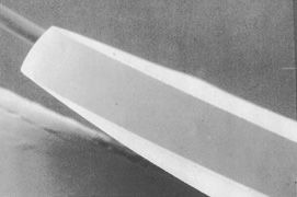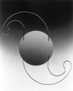 RETURN TO POSTERIOR CHAMBER LENSES John Pearce of the United Kingdom returned implantation to the posterior chamber by developing a rigid tripod-shaped PMMA IOL designed for implantation there,17 but it was Steve Shearing who would have the greatest influence on the future development posterior chamber IOLs. In March 1977, he introduced his IOL, which featured flexible posterior haptics (Fig. 9).18 His original intention was to have the haptics placed within the capsular bag remnant. The lens had a 5-mm optic (because that was the size of the Binkhorst optic, which was already in production at the time) and an overall length of 12 mm and was flat.