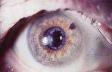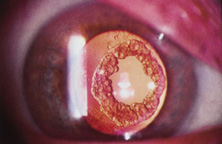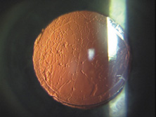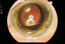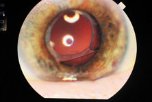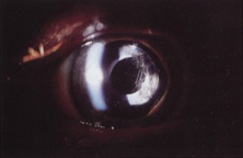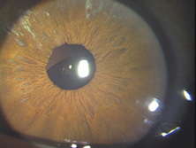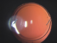 Rotation of Toric Plate Haptic Silicone Intraocular Lens Plate haptic toric IOLs produced by STAAR Surgical are 11.2 mm long for powers of 22.00 D and lower. The remainder are 10.8 mm long. The day after surgery, 90% of plate haptic toric IOLs are in good position relative to the axis marked with the patient upright before surgery. Up to 10% of them have rotated enough so that their power may be affected. Only rotations of 20 degrees or more are repositioned, usually 1 week after surgery to allow some capsular reaction to take place, reducing the risk of rerotation. A 10-degree rotation reduces effective astigmatic correction by 25%, and, in a worst-case scenario, a 90-degree rotation increases astigmatism. To achieve appropriate correction, these IOLs need to have their position adjusted. Rotation may be lessened by the newer 10.8-mm diameter (up from 10.5 mm). They are available in 2.00 D and 3.50 D models, which can correct approximately 1.50 D and 2.50 D of refractive cylinder. Alcon's single-piece toric model has been shown to exhibit very little rotation.221 (Fig. 84). Pupillary Capture After normal intraocular pressure is obtained, most clear corneal incisions will eventually show signs of leakage at surgery, if they are observed long enough. A very rare patient may experience an incision leak in the hours or days after surgery significant enough to shallow the AC. This may be the result of incision imperfection or a blow to the eye. If the pupil is still dilated, it will be possible to capture the optic partially or completely. Pupillary capture implies anterior capsulorrhexis capture. Also, it would be impossible to capture the optic by the pupil unless it had escaped the capsular bag. Patients with plate haptic lenses, regardless of the status of the incision or AC depth, will have to return to sterile conditions to have their IOLs placed back within the capsular bag. For patients with C-loop haptics, if the incision is still seen to be leaking with accompanying low intraocular pressure and shallow chamber, a return to sterile conditions will be required so that the incision can be closed and the IOL repositioned. In patients in whom the incision is no longer leaking, with normal IOP and a normal depth AC, pupillary dilation and then constriction after the IOL has fallen posterior may allow appropriate pharmacologic repositioning. The IOL will still be captured within the capsulorrhexis opening, but that should be of little consequence. Substantial changes to the iris and capsular bag architecture may occur if pupillary capture goes unnoticed for some time (Fig. 85). It is important to check the IOP and examine with the indirect ophthalmoscope because a shallow chamber may be produced by choroidal effusion or suprachoroidal hemorrhage immediately after surgery. Anterior Position of Crystalens™ Atropine is given after surgery to make sure that the optic is flexed posteriorly against the posterior capsule. An anterior position, which would change functional IOL power and pseudoaccommodative performance, could occur with postoperative wound leakage and chamber shallowing. Because of this, Dr. Cumming recommends the use of a scleral tunnel incision with the Crystalens™. He also recommends the SRK/T formula for axial lengths of 22.0 mm or longer and the Holladay II formula for shorter eyes.156 Capsular Bag Distention/Capsular Block Syndrome Capsular bag distention syndrome may have several different causes. Usually seen several days to weeks after surgery, it is characterized by a distended capsular bag with the IOL optic pushed forward slightly, usually creating a low-grade myopia (Fig. 86). It has been thought that trapped viscoelastic material could trigger this phenomenon. Micropipette studies have demonstrated residual viscoelastic within the capsular bag.222 Protein production by residual epithelial cells has also been mentioned as a possible cause. Distention can be created during the final intraocular pressure adjustment and stromal hydration incision sealing procedure. Finally, a bench test model experiment has demonstrated that fluid from the AC can be pushed back behind the IOL into the intracapsular space by saccadic eye movements.223 Treatment can be accomplished with a single 1.6-mJ shot from the YAG laser, making a small opening in the peripheral anterior capsule that allows egress of the trapped fluid. Pigment Dispersion and Uveitis, Glaucoma, Hyphema Syndrome This was a more common problem in the days of ciliary sulcus placement and asymmetric placement. It could occur with both posterior and AC IOLs.220,224 It can still be observed in capsular bag placement especially in cases of zonular laxity (e.g., pseudoexfoliation). In these cases, there can be substantial iridopseudophakodonesis, which may lead to transillumination defects in the shape of the haptics (Fig. 87). Deposition of pigment occurs in the angle over the trabecular meshwork and may be associated with increased intraocular pressure. Observation of pressure and optic nerve head anatomy should be conducted regularly because the outflow channels in patients with pseudoexfoliation may have been compromised previously. Because of the iridophakodonesis, intermittent bleeding and episodes of uveitis may also be noted independent of increased pressure, and IOL exchange may be necessary. There are several reports of such complication after implantation of both single- and three-piece Acrysof® IOLs into the ciliary sulcus.225,226 The AMO Sensar with a rounded anterior edge should be better for sulcus implantation of acrylic IOLs. Post-Nd:YAG Dislocation Nd:YAG laser capsulotomy has been performed in X, cross, triangular, and circular patterns. When using one of the linear patterns, the posterior capsular opening could extend to the capsular bag equator. Because plate haptic silicone IOLs are weakly held in place by capsular fibrosis, some of these were found to dislocate into the vitreous cavity after Nd:YAG