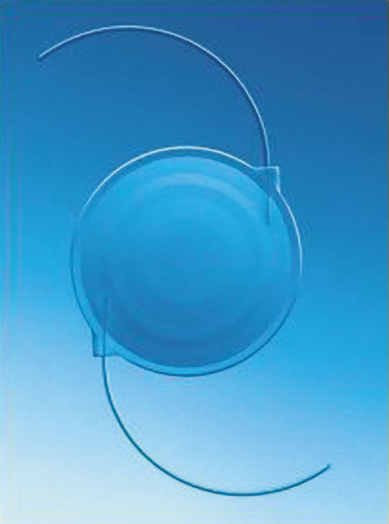 Because the capsular bag was such a hard place to find, the IOL was soon modified to include a 6-mm optic and 13-mm overall length. Even then, fixation was not perfect, and pupillary capture, just as Dr. Shearing had experienced in his fourth case, was not rare (personal communication, Steve Shearing, MD, 1998). However, an important step had been taken, and during the next two decades, the Shearing posterior chamber IOL would evolve into three basic styles. The first was designed primarily for ciliary sulcus fixation but could also be used for capsular bag fixation. It was the result of the tremendous influence of two popular, committed, prestigious California phacoemulsification surgeons who had trained together at Duke University, Dick Kratz and Bob Sinskey. The second was the short haptic diameter modified C-loop IOL designed for capsular bag placement. The third featured larger haptic and optic diameters and was designed for surgeons still practicing planned ECCE who might place the IOL within the sulcus or asymmetrically with one haptic in the sulcus and one in the capsular bag. The Kratz IOL was compatible with Kratz's phacoemulsification technique, which involved a prolapse of the superior nuclear pole into the iris plane for external attack phacoemulsification. In this technique, remaining anterior capsule was a problem because it could produce asymmetric placement and decentration. Therefore, anterior capsulotomies were large so that the IOL could be placed in the ciliary sulcus. Kratz developed a “tap test” that involved tapping the eye over the ciliary sulcus with a Weck sponge to see whether the IOL would move, which would indicate that the haptic was in contact with the structures of the ciliary sulcus and not hung up in the capsular bag remnant. Through the Precision Cosmet Company (Minneapolis, Minnesota), Kratz introduced a 10-degree optic posterior angulation as an effective way to prevent pupillary capture. The resistance to compression of the haptics was softened significantly by a side optic mounting modification with the overall length of 13.5 mm. Actually, before that, more than a few surgeons had been bending the Shearing haptic at the optic haptic junction to try to reduce compression resistance. Sinskey's lens was very similar and was introduced at about the same time, but by a different company, IOLAB (San German, Puerto Rico). Because of the nearly simultaneous introduction and similarity, the lens ultimately has been called the Kratz-Sinskey IOL (Fig. 11).