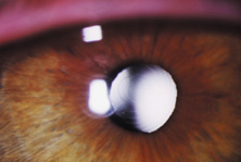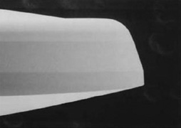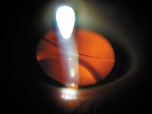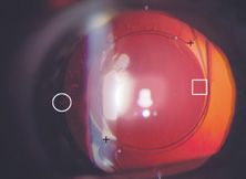With most of the lenses, the onset of the opacification occurred from 6 months to years past the operation; the lens opacifications have occurred in only a handful of lenses. This has, unfortunately, at present served to give this material a poor reputation. Virtually all problems seen were based on faulty manufacturing, either at the time of formation of each company's polymer or during fabrication and packaging of the lens. For example, a hydrophilic acrylic material manufactured by Rayner Corporation has been implanted in approximately 1 million cases in 5 years with no report of primary calcification (data in file at Rayner Corporation). Pseudophakic Dysphotopsia The potential for flare, streaks, halos, shadows, and other abnormal visual perceptions239 in the pseudophakic patient (termed pseudophakic dysphotopsia (Olson RJ: IOL exchange to correct severe glare in 5.5 mm AcrySof patients. Presented at the Symposium on Cataract, IOL and Refractive Surgery, San Diego, CA, April 1998) have been present in every IOL design since Ridley's first implantation in 1949. The phenomenon is increased in incidence and severity by the use of small-diameter optics or truncated ovoid optics.60,240–245 Pseudophakic dysphotopsia is underdiagnosed because many patients will tolerate mild to moderate symptoms without ever saying much of anything about them. Other patients are more persistent in their willingness to articulate their experiences, which makes it easier to diagnose pseudophakic dysphotopsia. Some patients feel absolutely possessed by their visual distractions and find them virtually unbearable. If asked about them in a specific questionnaire, 20% of pseudophakic patients will report some type of abnormally imaged side effect.240 Although sometimes severe, these symptoms have usually been transient and clinically insignificant. However, these abnormal secondary perceptions attained contemporary interest because of their apparent increased incidence and severity in the very popular AcrySof® IOL.134,221,246–263This continues to be a reason for IOL exchange in a small but significant number of patients with this lens design and in patients implanted with similar designs as well. The dysphotopsia can be divided into “positive,” bright spots and streaks (Fig. 93),240 and “negative,” straight or slightly curved temporal dark shadows that appeared to be dark to the patient (Fig. 94).260 The combination of high refractive index hydrophobic acrylic material, square edge, and relatively flat anterior surface is especially prone to this complication. The square edge, which is a key feature in reducing central epithelial proliferation and resultant PCO, has been incriminated in a ray tracing analysis study. The internal reflection from the IOL edge diverts light rays to the opposite retinal field, casting a shadow where they otherwise would have struck the retina (Figs. 95 and 96).134 Other ray-tracing studies found that the relatively flat anterior surface of the high index refraction IOL may contribute to dysphotopsia.251,258An external light source at approximately 1 to 25 degrees to the optical axis can result in an internal surface reflection that is round or oval in shape and occurs with pupil sizes as small as 3.2 mm (Fig. 97). Alcon engineers responded with three key design modifications that were ultimately introduced in its single-piece models and later in its MA30AT and MA60AT three-piece models to improve optical performance. First, the power curves of the optics were reversed so that the relatively flat 5.5 D, which had defined the anterior surface, was placed on the posterior surface with the relatively more round dioptric power curve on the anterior surface. Second, the edge was modified in a proprietary process so that it was rendered antireflective (Fig. 98). And third, the edge was thinned to 0.22 mm from its immediately preceding 0.3 mm on the MA30AL and MA60AL (it was 0.4 mm thick at its introduction on the MA60AL) (personal communication, Alcon Surgical, November 2002).